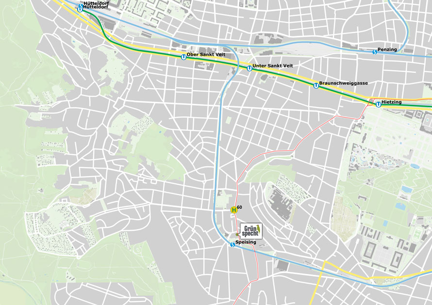 Der erstklassige Anschluss an die öffentlichen Verkehrsmittel ist einer der vielen Vorzüge von Grünspecht13. An der nahegelegenen Haltestelle Preyergasse halten die Buslinien 56A und 56B sowie die Straßenbahnlinie 60. Darüber hinaus liegt der Bahnhof Speising nur eine Gehminute entfernt, von hier aus erreicht man in rund 30 Minuten den Stephansplatz oder ist in nur 7 Minuten in Hütteldorf. Die S80 fährt von Speising aus direkt zum Hauptbahnhof und das schon bald in einem noch kürzeren Intervall. Auch per PKW stehen einem von hier aus alle Möglichkeiten offen – die A1 erreicht man in rund 10 Minuten, den Stephansplatz über den Hietzinger Kai oder die Edelsinnstraße in etwa 30 Minuten. Dank der bequemen Garagenstellplätze direkt im Grünspecht13 spart man sich zudem auch die Parkplatzsuche und somit wertvolle Zeit und Nerven. Neben den E-Tankstellen in der hauseigenen Tiefgarage liegen vis-à-vis weitere, öffentliche E-Tankstellen-Plätze. Aber auch Besucher können entspannt sein, denn in der Umgebung kann man gebührenfrei parken.